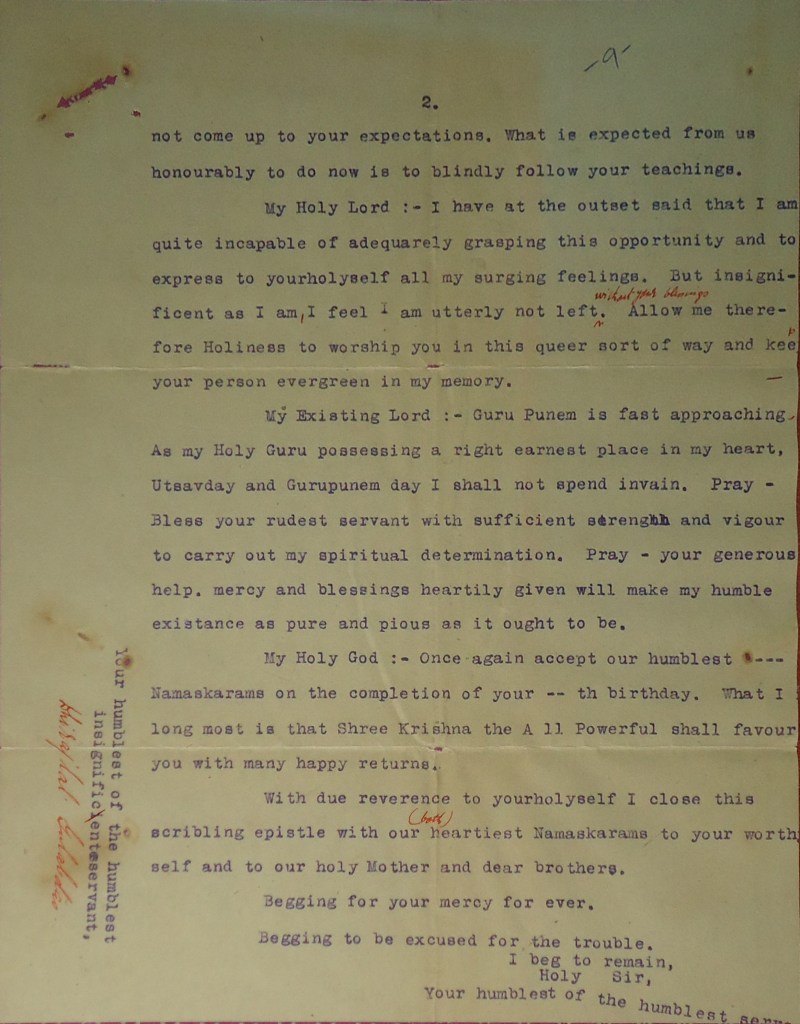 I beg to request your holyself to accept our humblest Pranams on this memorable occasion. Pray Accept our………heartiest congratulations on this your birthday from one of the humblest of the humblest insignificant (insignificant) servants of yours. I know not what more to say on this memorable occasion but to place my head at your lotus feet reverentialy and at the same time to send up my silent prayer to the Almighty Shree Krishna for his (His) act of grace by giving us the benefit of your person to the suffering humanity at this juncture